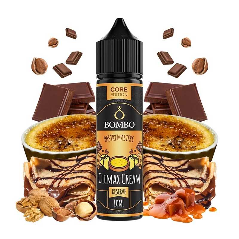 Τo Climax Cream Core Edition 10ml/60ml, από τη σειρά Pastry Masters της Bombo, δίνει αρωματική κρεμ μπρουλέ πάνω σε βάση κρέπας, με κομμάτια σοκολάτας, τραγανούς ξηρούς καρπούς και καραμελωμένες πινελιές για πολυεπίπεδη εμπειρία.