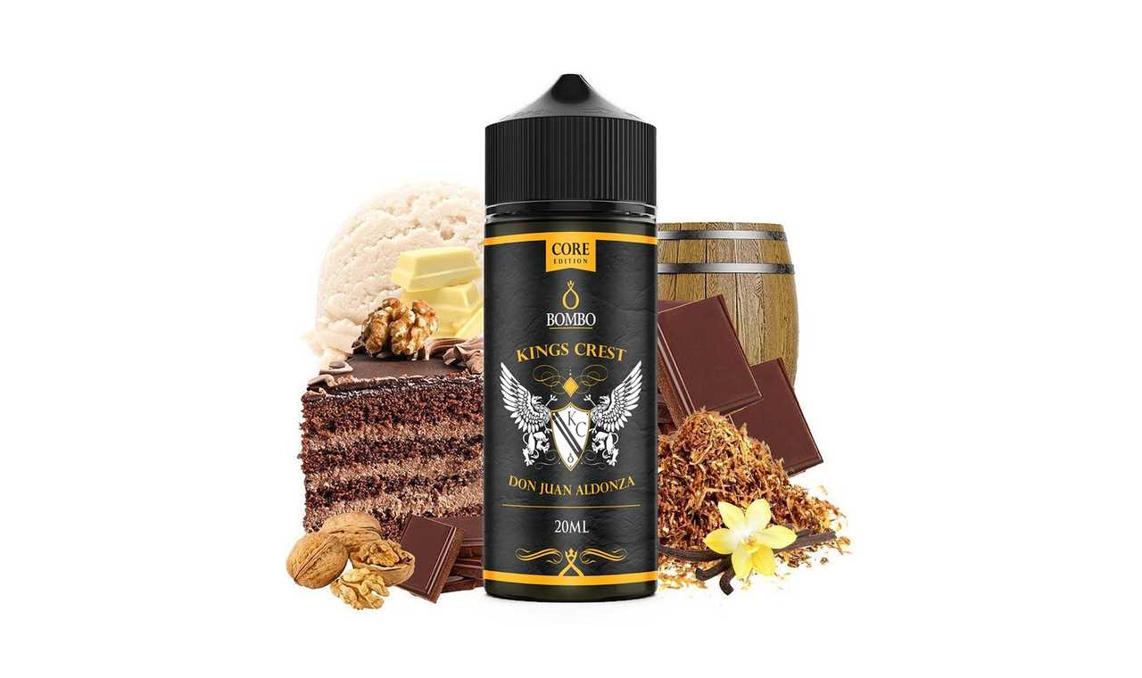 Τo Bombo x Kings Crest Don Juan Aldonza 20ml/120ml δίνει σοκολατόπιτα με νότες καρυδιού pecan, σαντιγί και μια βουτυράτη κρούστα από κράκερς μαζί με εκλεκτές νότες καπνού και βανίλιας παλαιωμένες σε αμερικάνικα δρύινα βαρέλια.